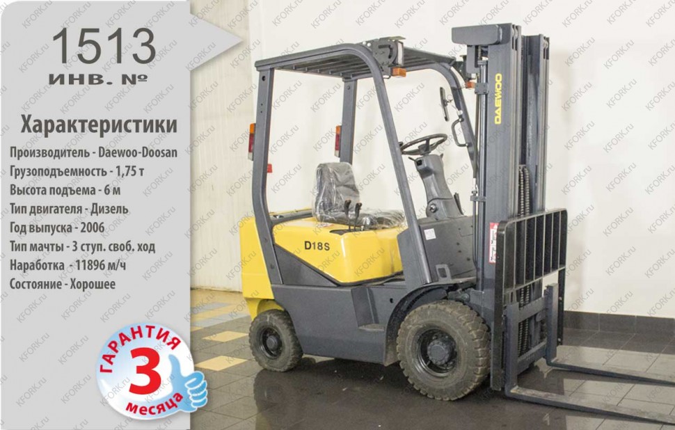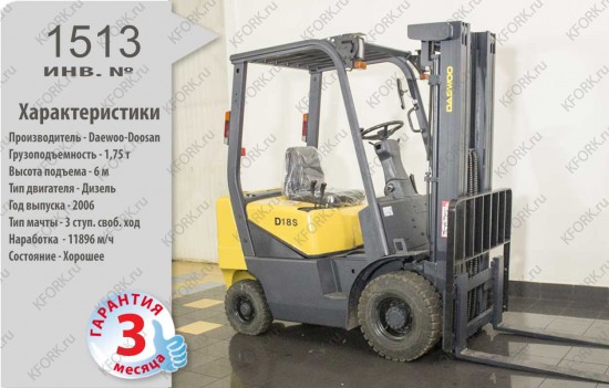 Дизельный автопогрузчик Daewoo-doosan Б/У с интентарным номером 1513 2006 года выпуска. Состояние - Хорошее. Имеет грузоподъемность 1750 кг. Гарантия: 3 мес или 500 м/час.